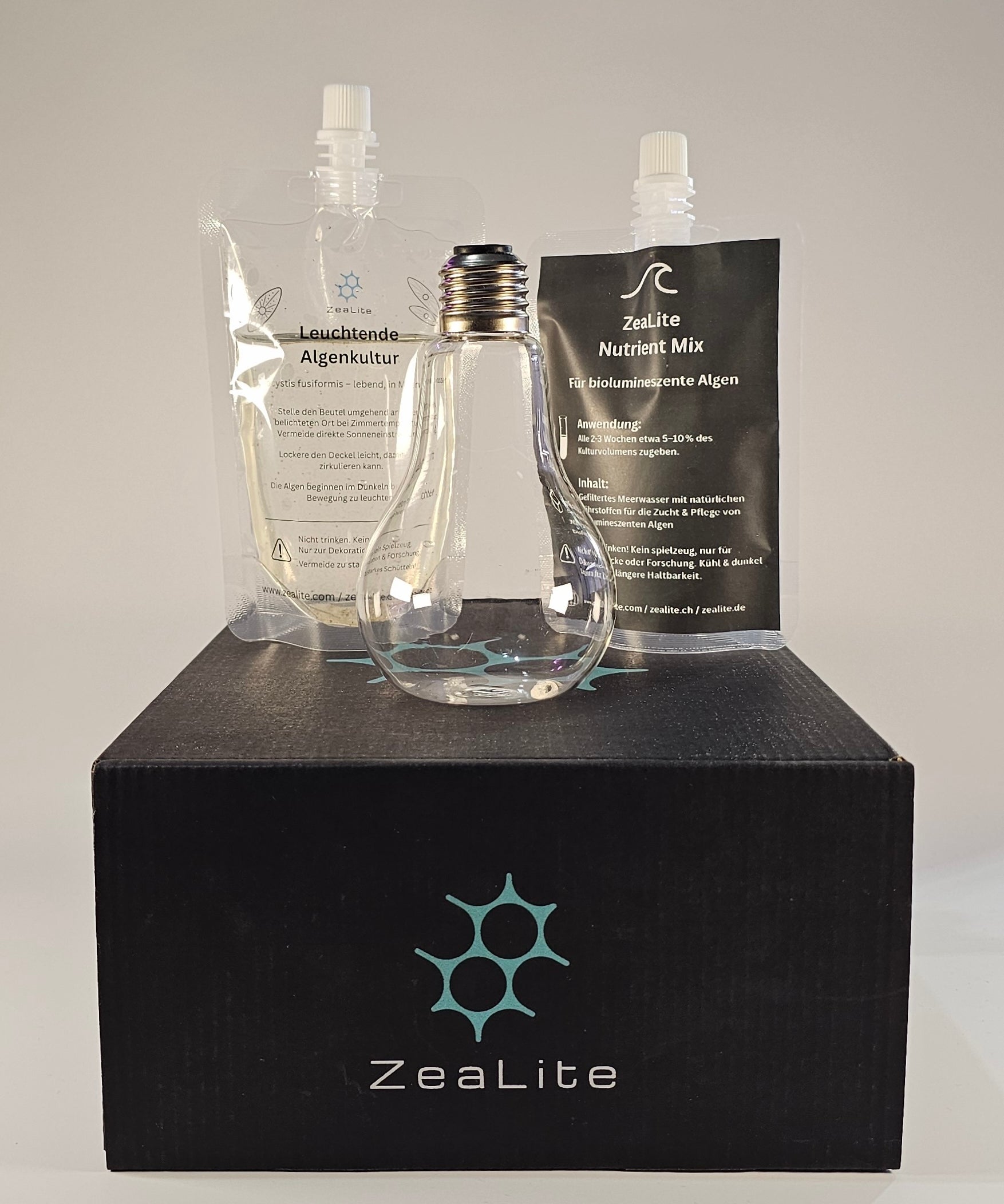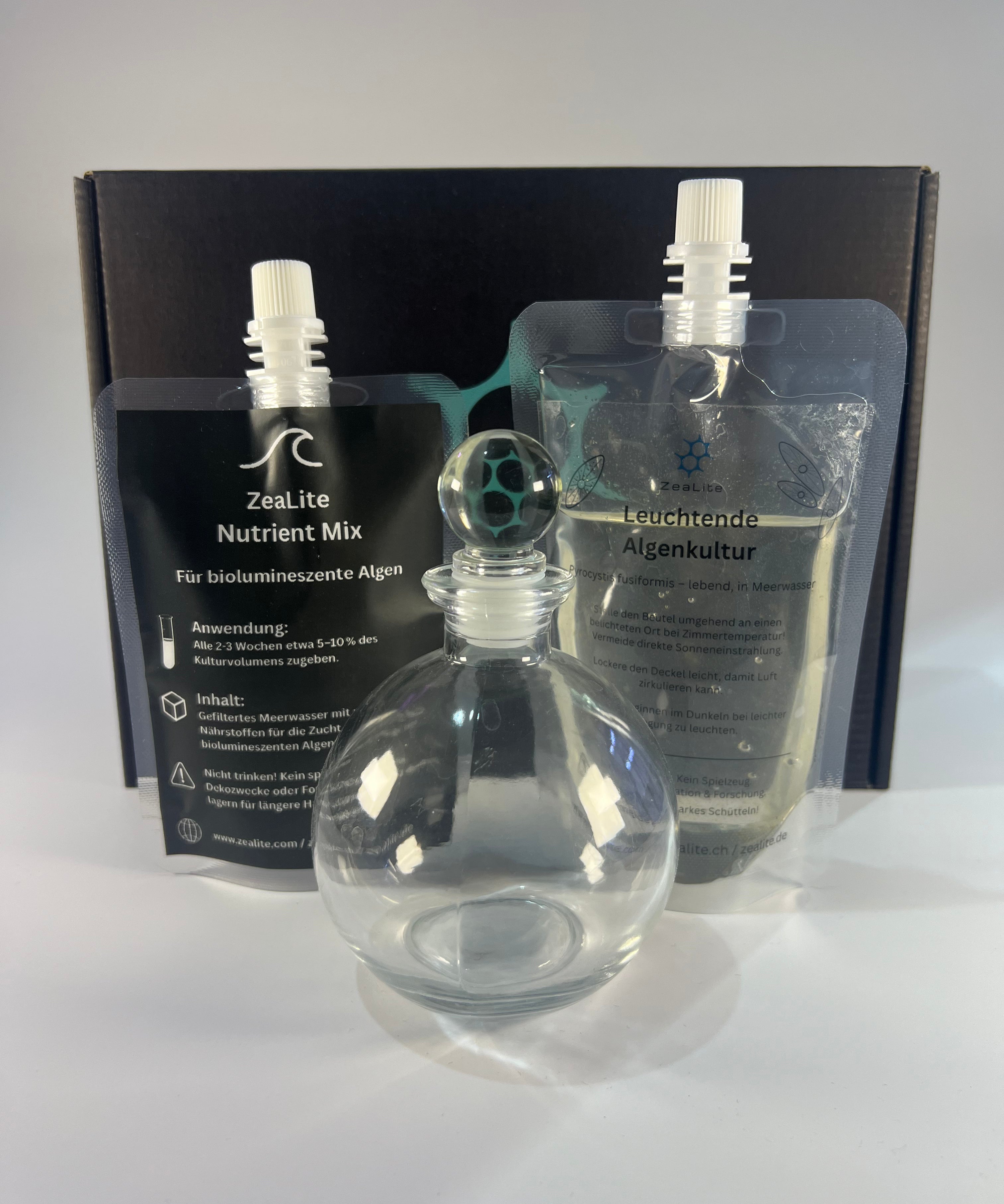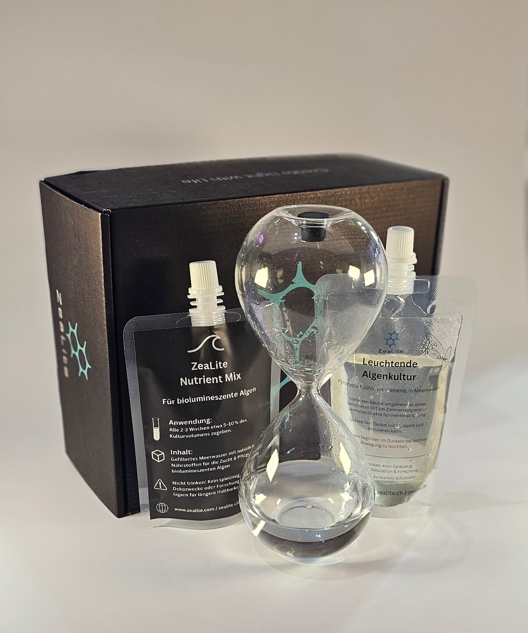 ZeaLite's 200ml contains a specially cultivated culture of bioluminescent algae that naturally emits a mesmerizing blue light when moved. This culture is ideal as a refill for the GlowBottle or Hourglass, creating atmospheric lighting effects.
