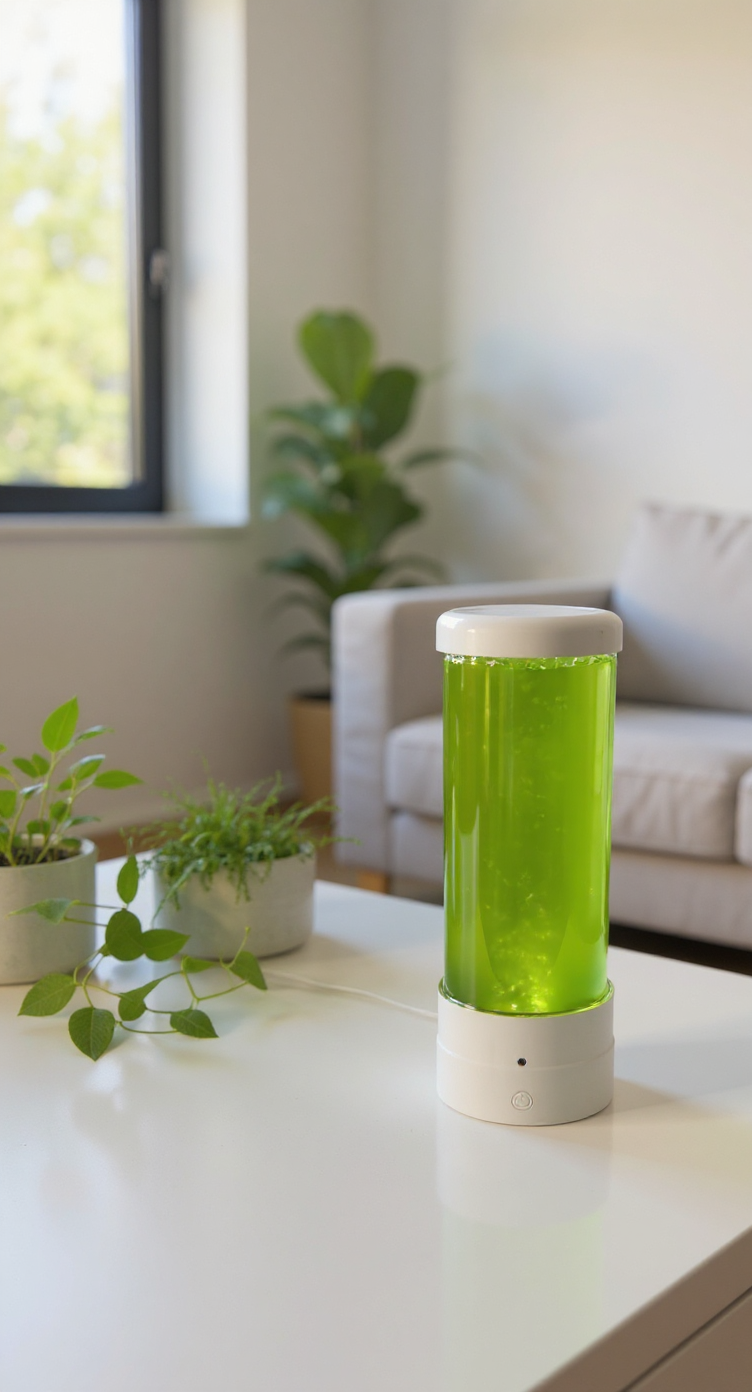 Der AlgaeTower ist ein kompakter Photobioreaktor für den Innenraum. Im Inneren zirkuliert eine lebende Kultur der MikroalgeChlorella vulgaris. Mithilfe von Licht und einer leichten Belüftung durch eine geräuscharme Luftpumpe betreiben die Algen Fotosynthese. Dabei nehmen sie Kohlendioxid aus der Umgebung auf und geben Sauerstoff ab, ähnlich wie Pflanzen, nur konzentrierter und kontrollierter.